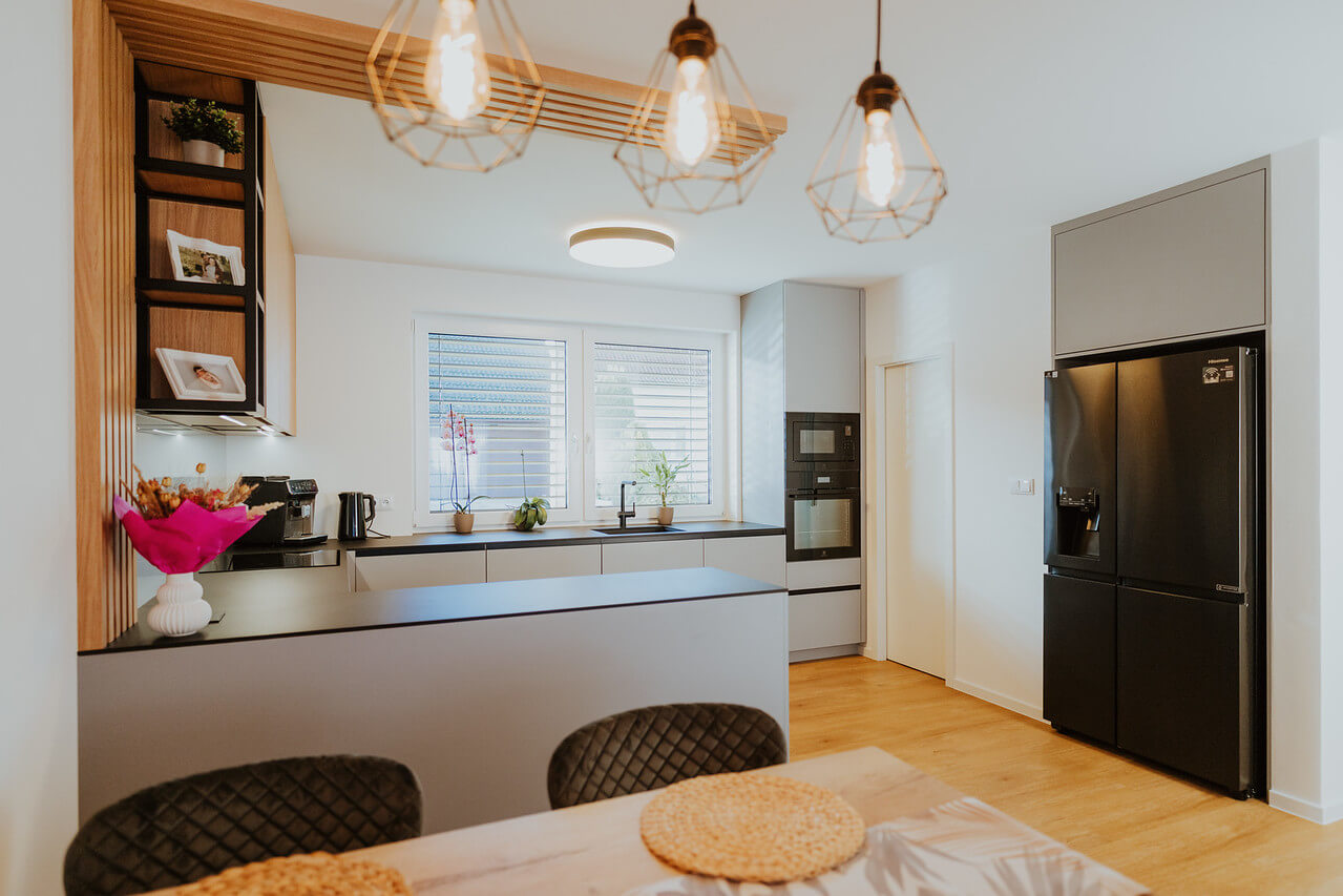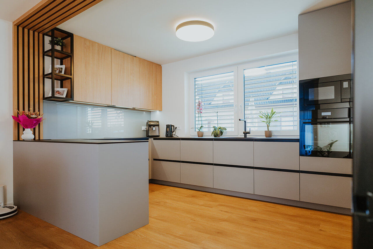Dominantním detailem je lamelový prvek v dřevodekoru s navazující kovovou otevřenou policí. Je to drobný akcent, který kuchyň odlehčuje a dodává jí osobitost bez toho, aby rušil celkovou čistotu.