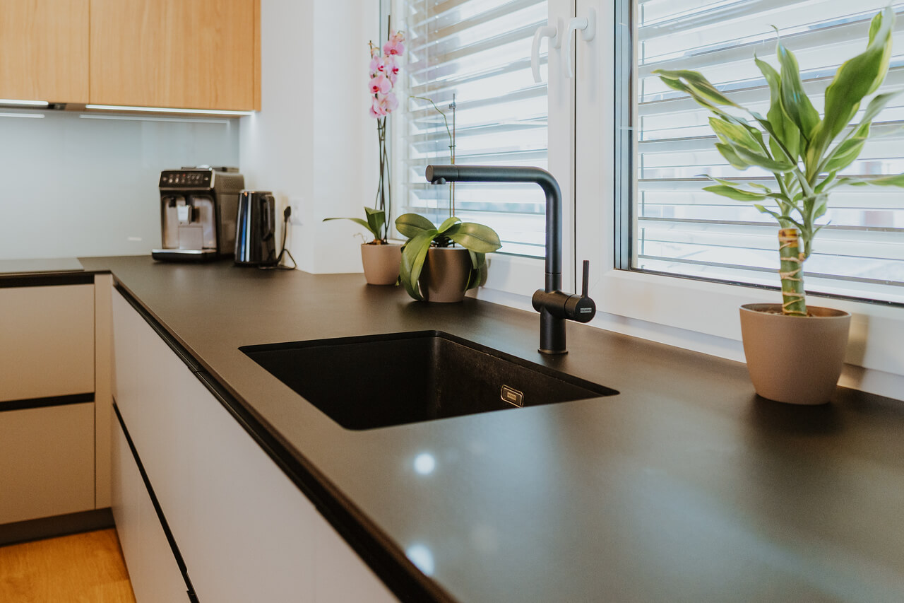 Šedý dekor Kronospan K519 SU ve spodní části dává kuchyni klidný základ, na který navazuje dubový dřevodekor Fundermax 0831 NI horních skříněk – ten prostor zatepluje a dělá ho útulnější. Tmavá kompaktní deska Egger U999 ST76 celý celek uzemní a zároveň působí jako kontrast. Sklo Lacobel na zástěně pak kuchyni opticky projasní a uhladí.