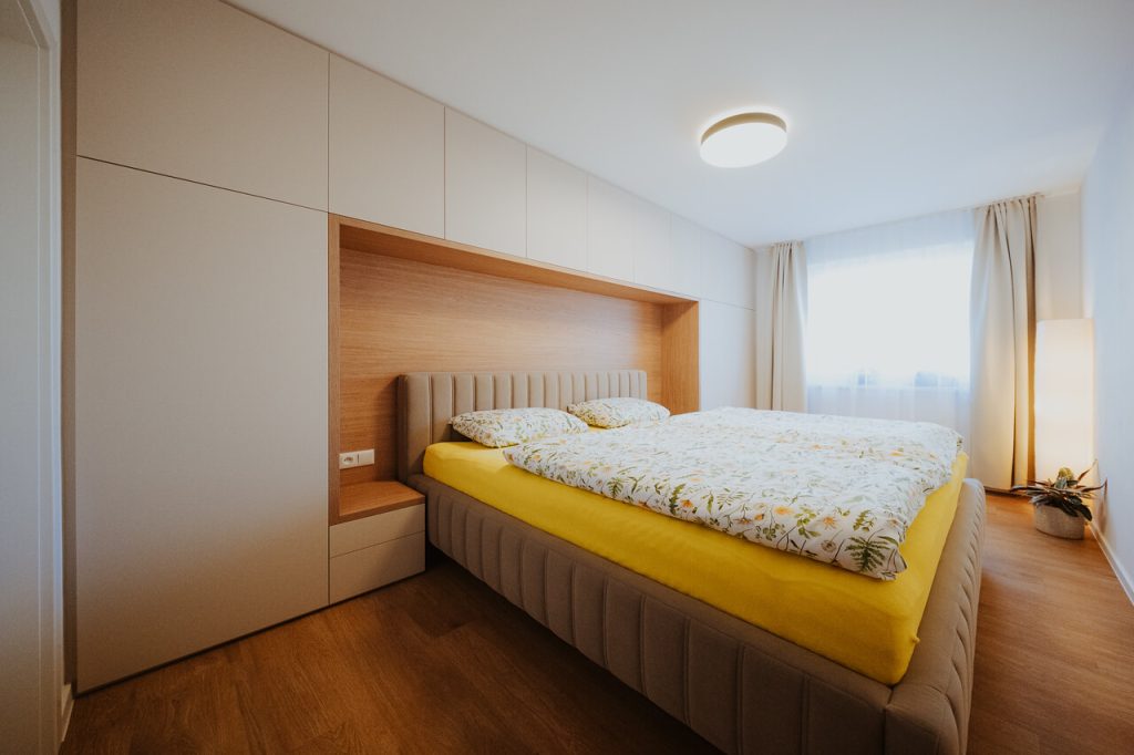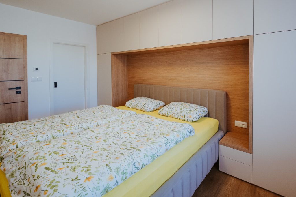 V ložnici jsme řešili kompletní vestavnou úložnou stěnu až ke stropu, která rámuje prostor postele. Cílem bylo dostat do místnosti maximum úložného prostoru, ale zachovat klid a jednoduchost, která je pro ložnici zásadní.