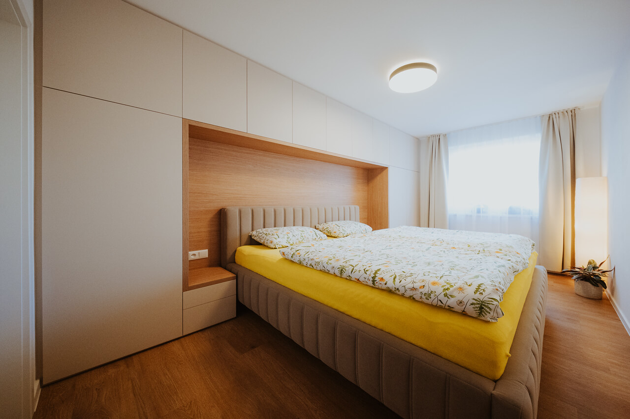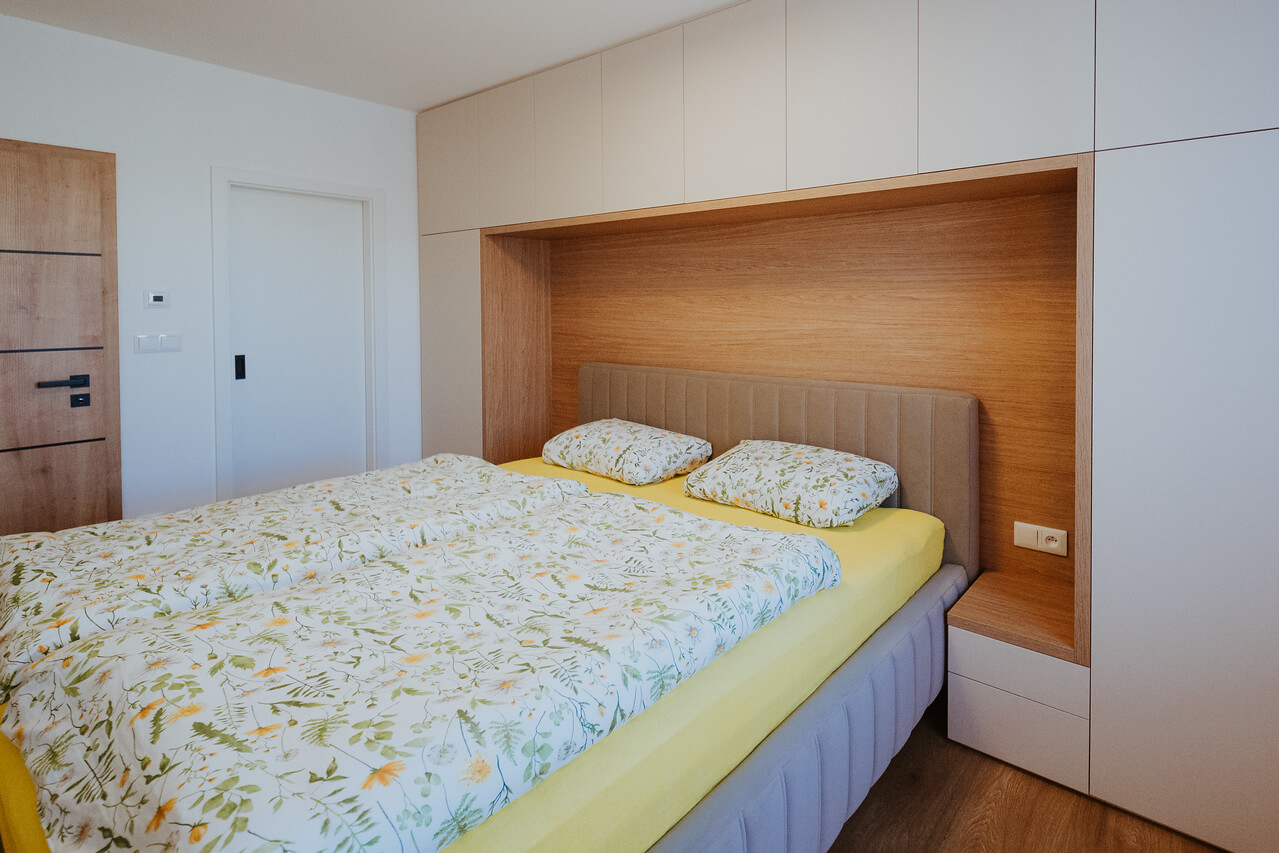 Do rodinného domu v Čejči jsme realizovali nábytek na míru do dvou hlavních zón – kuchyně a ložnice. Výsledkem je kuchyň s výraznou linií a příjemným teplem dřeva a ložnice s velkorysým úložným řešením, které přirozeně rámuje prostor.