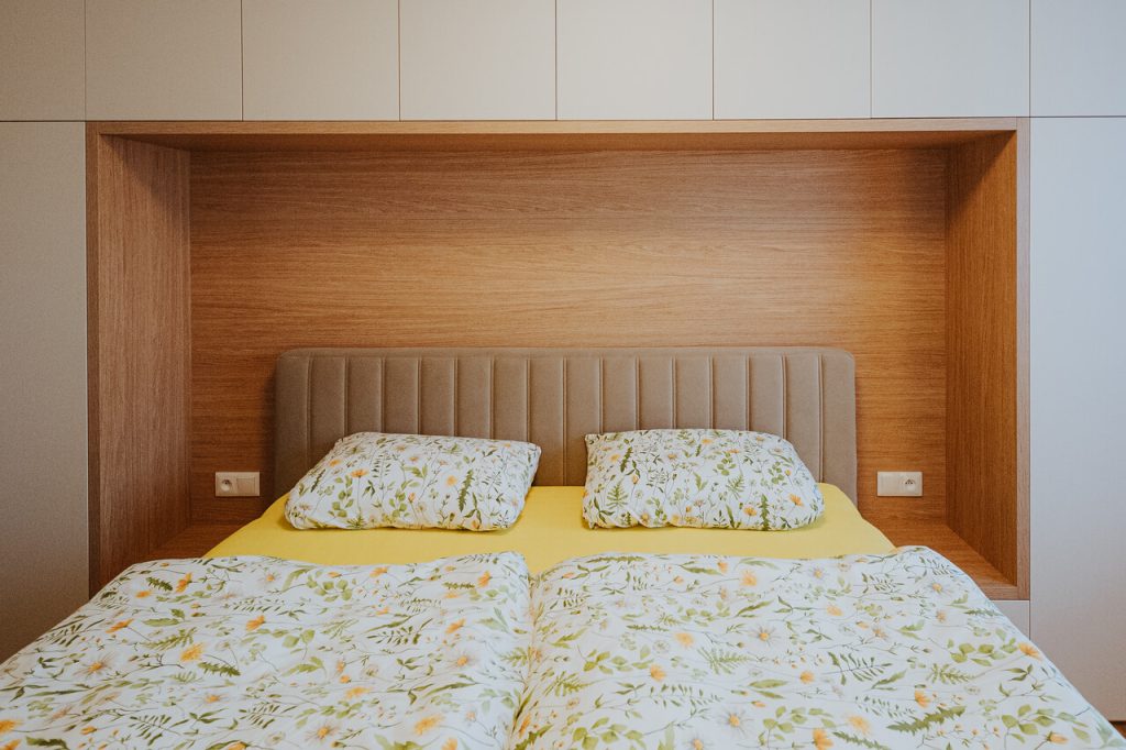 Dekor Kronospan 7045 SU Satin působí jemně a neruší, zatímco dřevodekor K695 PV vytváří teplý akcent v části za postelí. Nika zároveň slouží jako vizuální i funkční centrum místnosti. Postel je do ní přirozeně zasazená a doplněná o odkládací plochy, takže není potřeba další solitérní nábytek.
